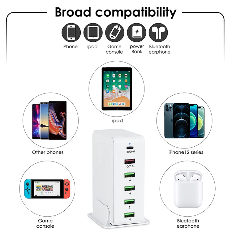 6 in 1 65W PD USB-C / Type-C + QC 3.0 USB + 4 USB Multi-port Travel Charger, US Plug(White)