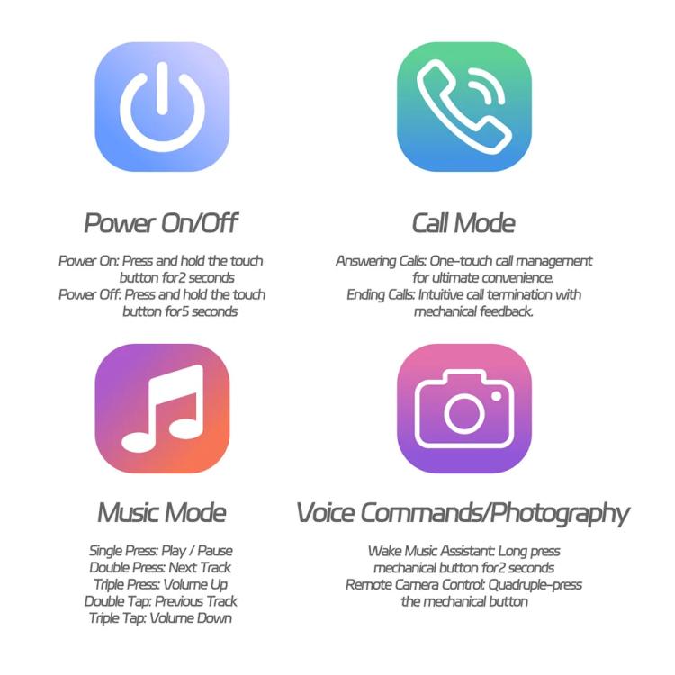 2. Main Functions: Bluetooth Calling / Voice Assistant / Remote Photo Capture / Music Track Control.