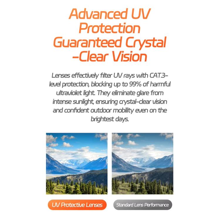 4. Sunglasses lens effectively filters ultraviolet (UV) rays with CAT3-level glare reduction, minimizing dazzling effects under intense sunlight. Ensures clear vision and confident travel on bright days.