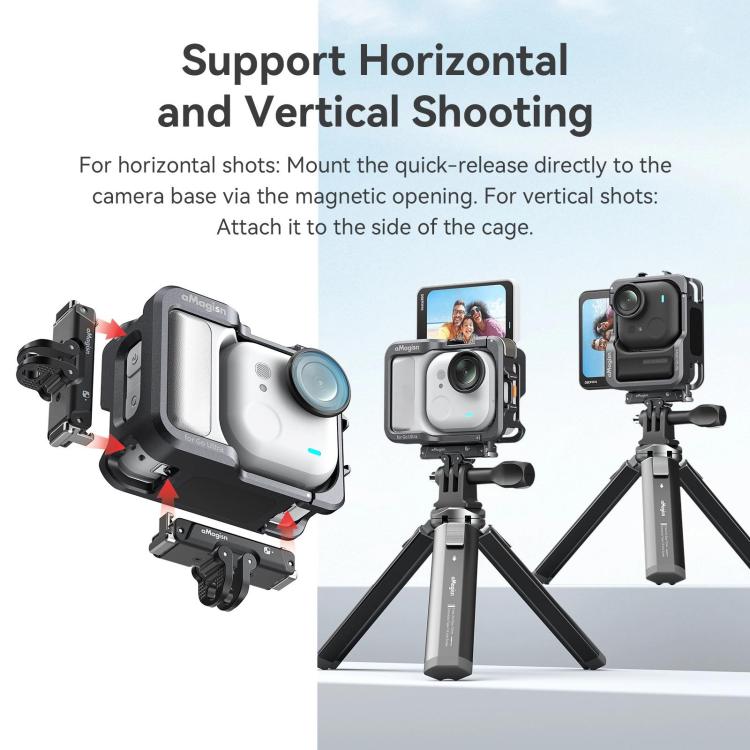 3.  Seamless Switch Between Front & Selfie Modes: The cage's quick-release mount features a non-polar magnetic design. When mounted for portrait shooting, simply rotate the camera 180 degrees without removing the base plate to effortlessly switch between front-facing and selfie modes.