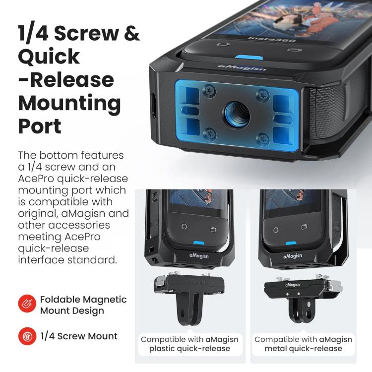 3. Quick-Release & Multi-Compatible Base: Features a 1/4 inch screw thread and Ace Pro quick-release interface. Compatible with Insta360 Ace Pro//aMagisn Ace Pro quick-release systems and third-party accessories following Ace Pro standards.