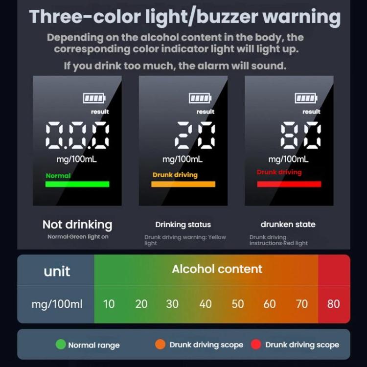 11. Three-color light/buzzer warning: the corresponding color of the light illuminates according to the blood alcohol content, and a buzzer will alert you if you have consumed too much alcohol