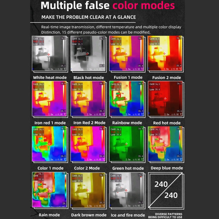 3. Real-time image transmission, different temperatures in different colours to distinguish between high and low, can be modified to 15 different pseudo-colour mode