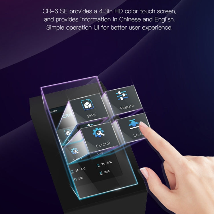 11. Intuitive user experience. The CR-6 SE 3D printer features a 4.3 inch HD color LCD touch screen that allows you to easily and intuitively operate the device. Available in English and Chinese, and with a simplified and smart interface, this touch screen ensures that this printers user experience always equates to smooth sailing.
