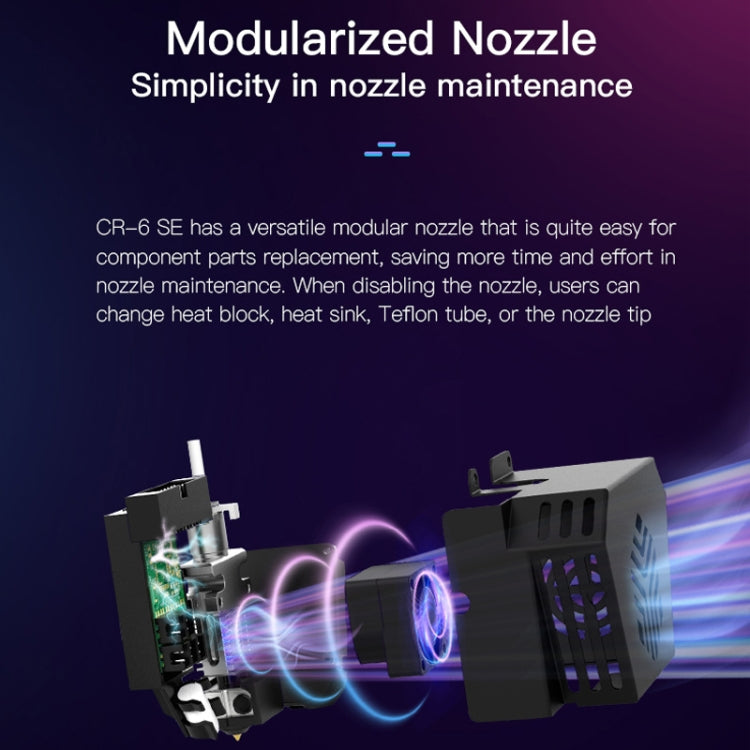 4. Modular nozzle. The CR-6 SE is designed with a modular nozzle that means you can customize it. From the heat block to the nozzle tip, among other parts, this is a Modular 3D Printer that is easy to keep.
