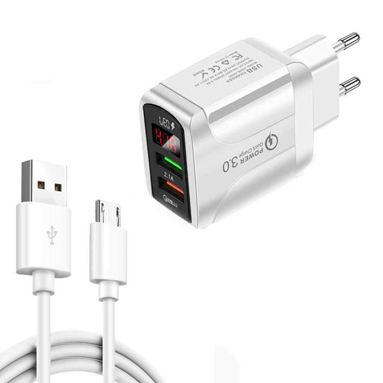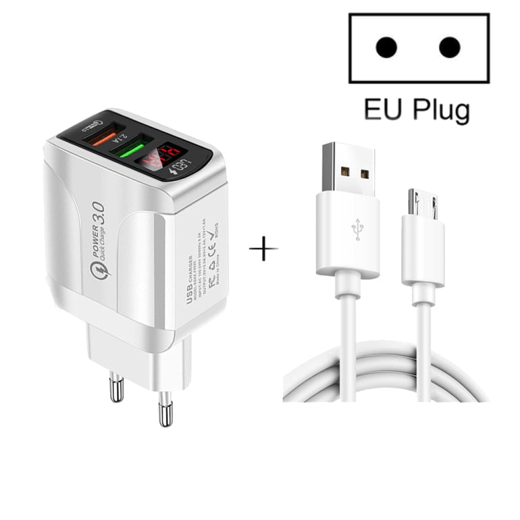 F002C QC3.0 USB + USB 2.0 LED Digital Display Fast Charger with USB to Micro USB Data Cable, EU Plug(White)