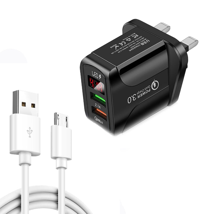 F002C QC3.0 USB + USB 2.0 LED Digital Display Fast Charger with USB to Micro USB Data Cable, UK Plug(Black)