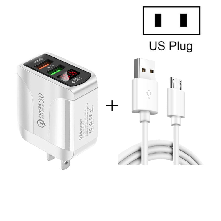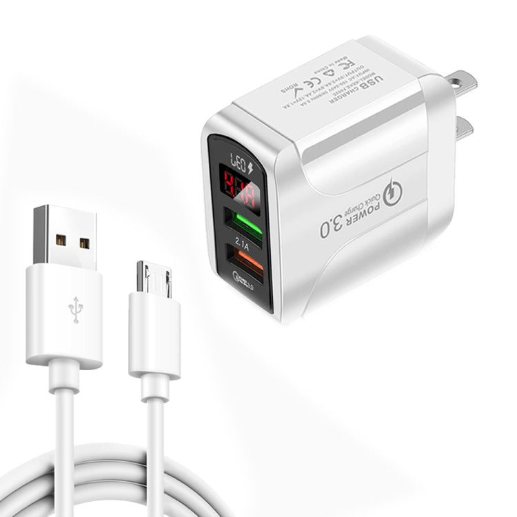 F002C QC3.0 USB + USB 2.0 LED Digital Display Fast Charger with USB to Micro USB Data Cable, US Plug(White)