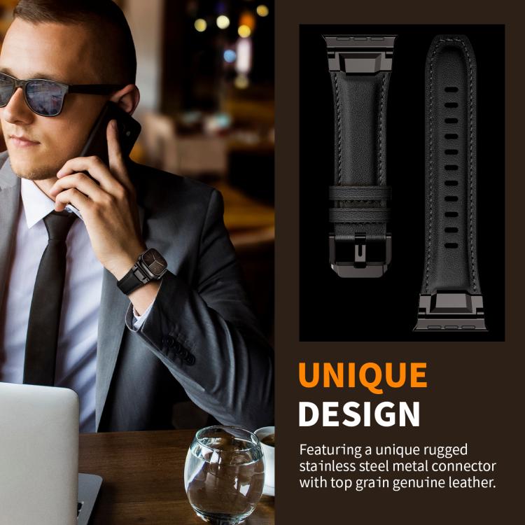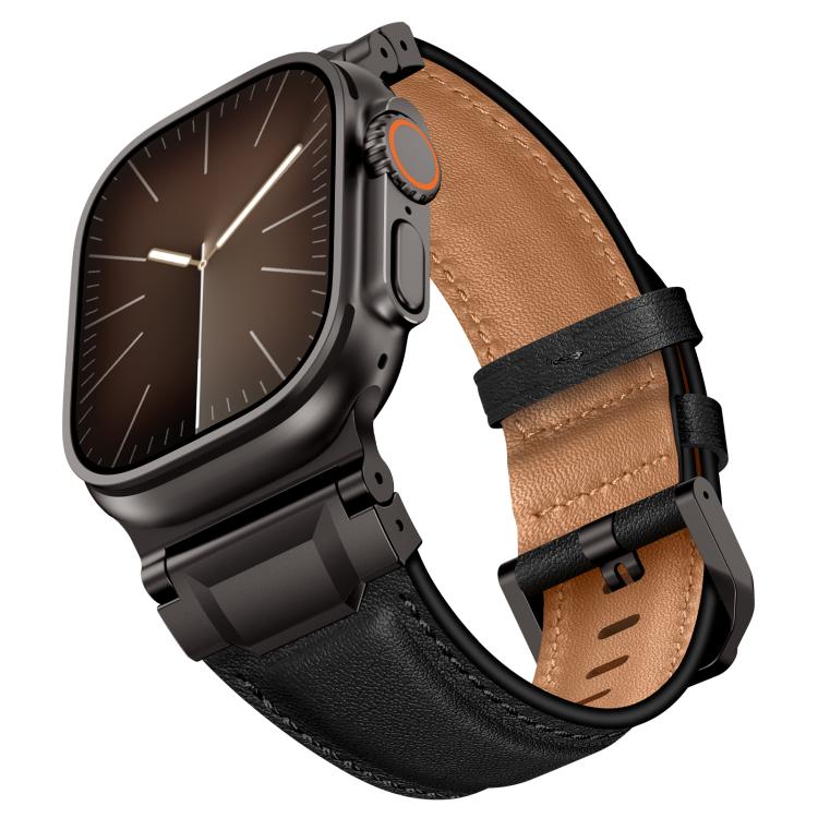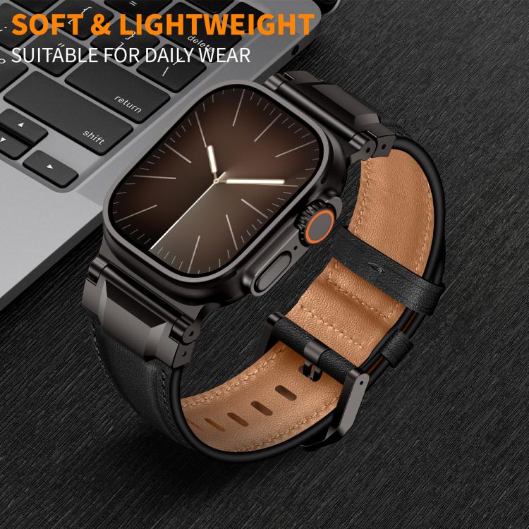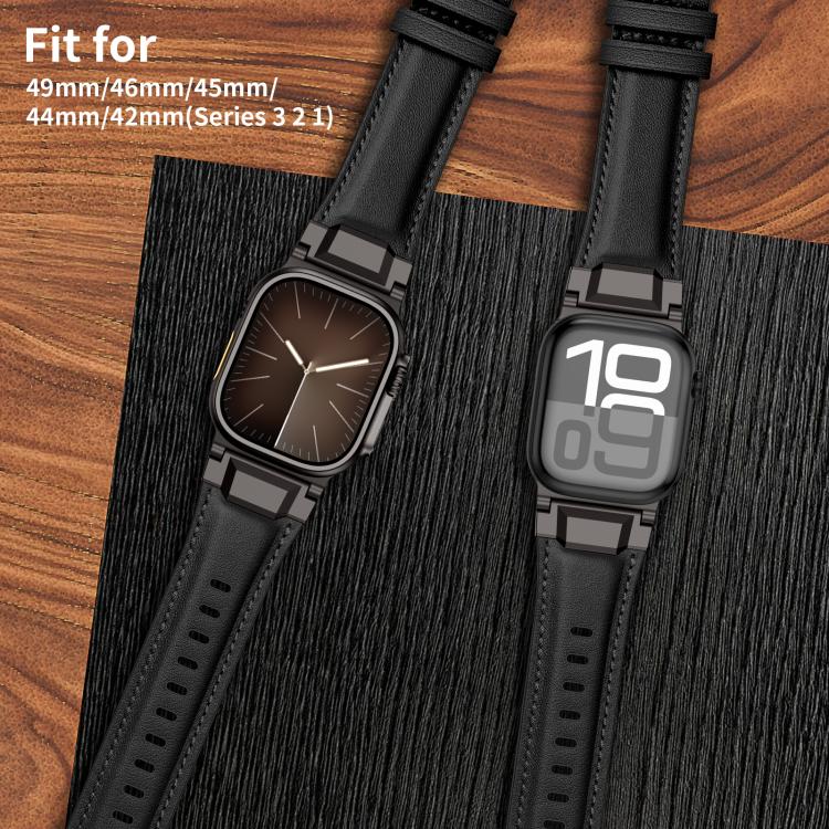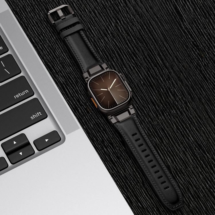 For Apple Watch 46mm / 49mm / 45mm / 44mm Armour-style Leather Watch Band(Black Nappa Leather Black Buckle)