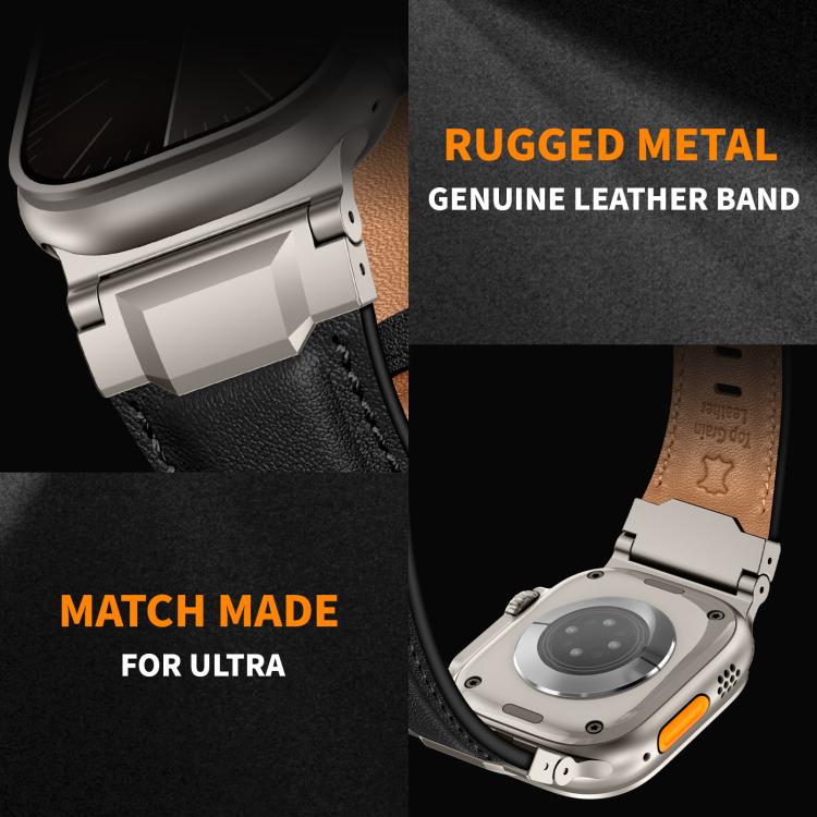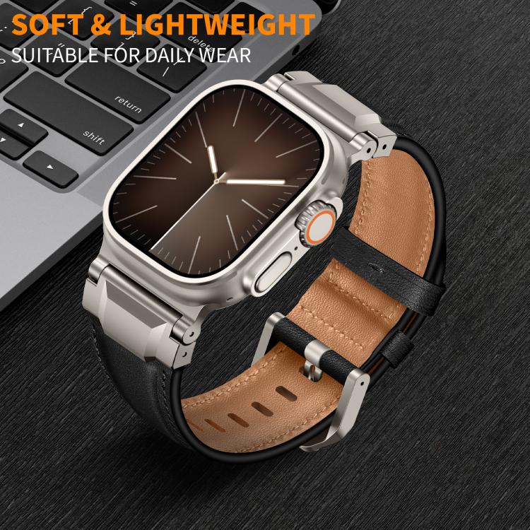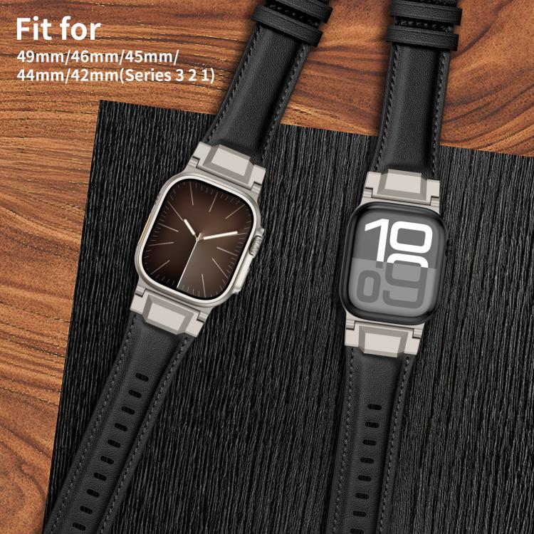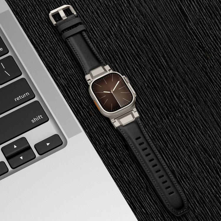 For Apple Watch 46mm / 49mm / 45mm / 44mm Armour-style Leather Watch Band(Black Nappa Leather Titanium Buckle)