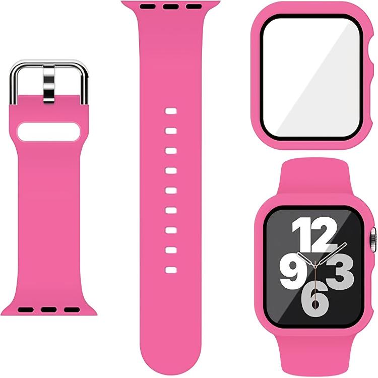 For Apple Watch Series 41mm Pin Buckle Silicone Watch Band with Film Integrated PC Case(Rose Red)