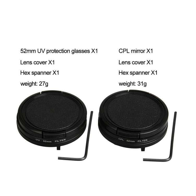 For GoPro HERO5 Proffesional 52mm Lens Filter(CPL Filter + Lens Protective Cap + Hex Spanner) & (UV Filter + Lens Protective Cap + Hex Spanner)