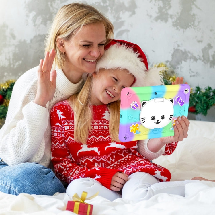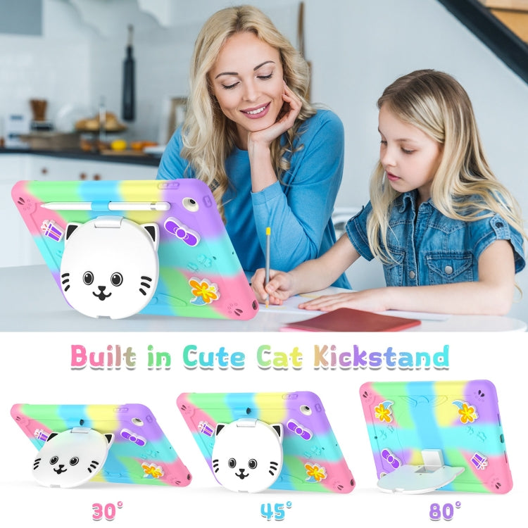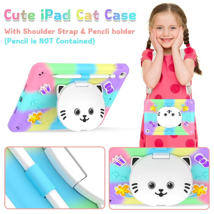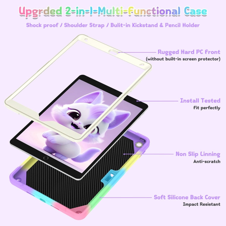 For iPad 10.2 2021 / 2020 / 2019 Cat Holder Silicone Hybrid PC Tablet Case with Strap(Colorful Purple)
