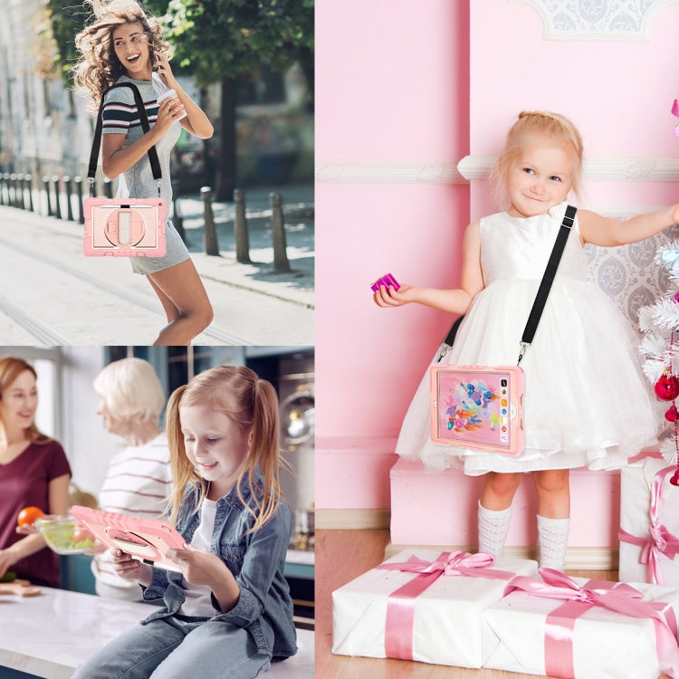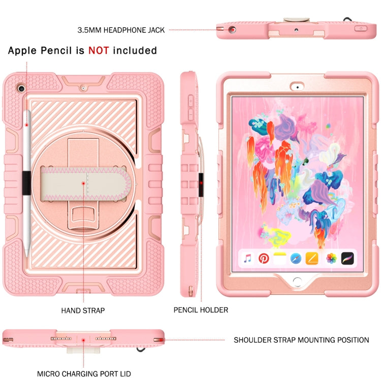 For iPad 9.7 2018 / 2017 360 Degree Rotation Contrast Color Shockproof Silicone + PC Case with Holder & Hand Grip Strap & Shoulder Strap(Rose Gold)