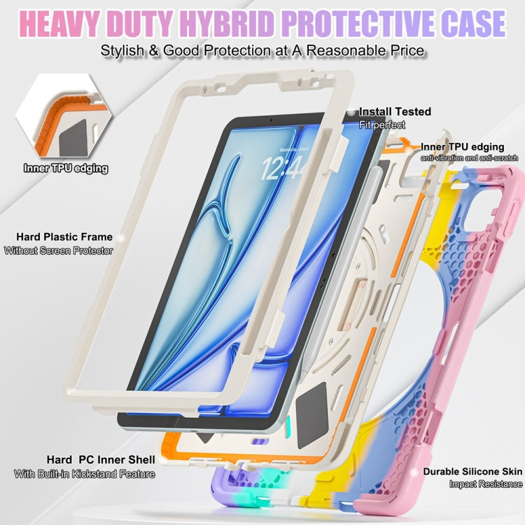 For iPad Air 11 2024 / Air 11 2025 Rotatable Holder Silicone Hybrid PC Tablet Case with Shoulder Strap(Colorful Pink)