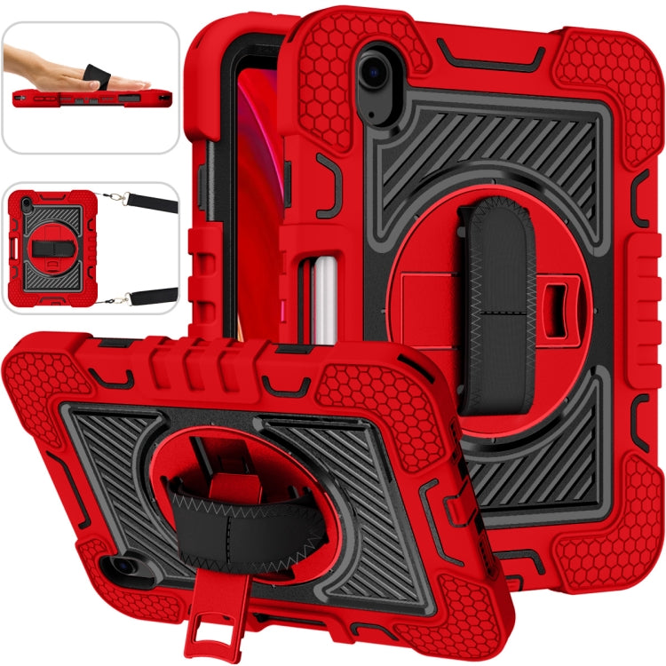 For iPad mini 2024 / mini 6 360 Degree Rotation Contrast Color Shockproof Silicone + PC Tablet Case with Holder & Hand Grip Strap & Shoulder Strap(Red+Black)