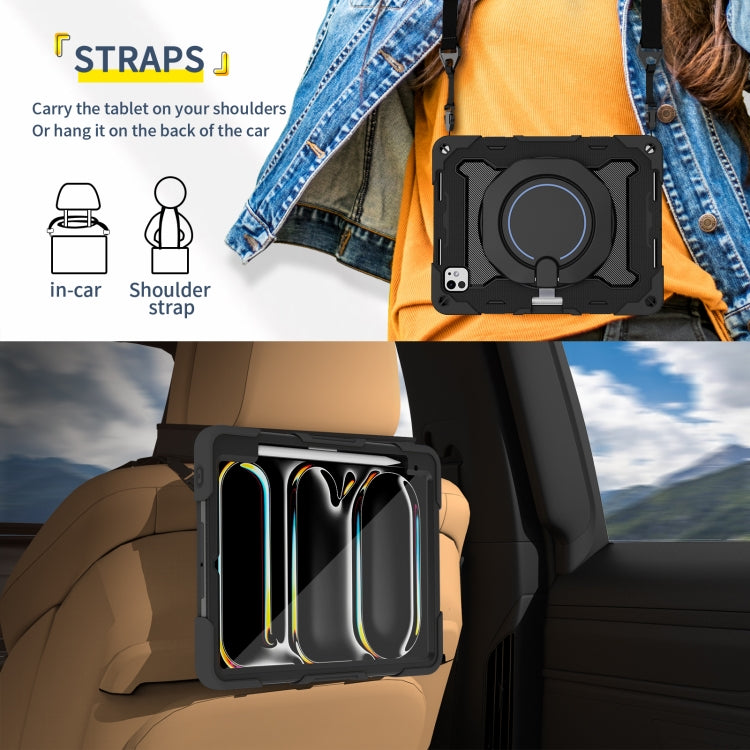 For iPad Pro 11 2024 Armor Portable Rotating Ring Holder Silicone Tablet Case with Pen Slot(Black)