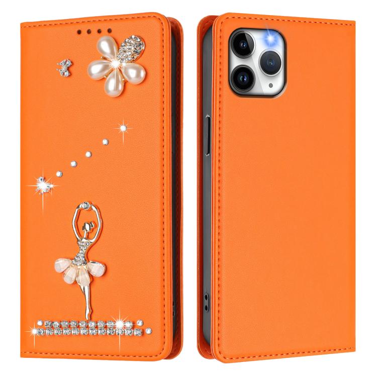 For iPhone 11 Pro Ballet Girl Diamond Studded RFID Vegan Leather Phone Case(Orange)