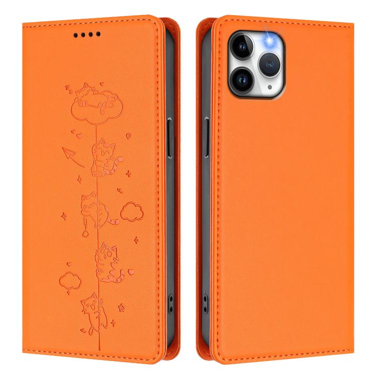 For iPhone 11 Pro Cute Cats Embossed Magnetic RFID Vegan Leather Phone Case(Orange)