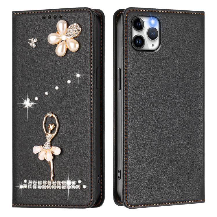 For iPhone 11 Pro Max Ballet Girl Diamond Studded RFID Vegan Leather Phone Case(Black)