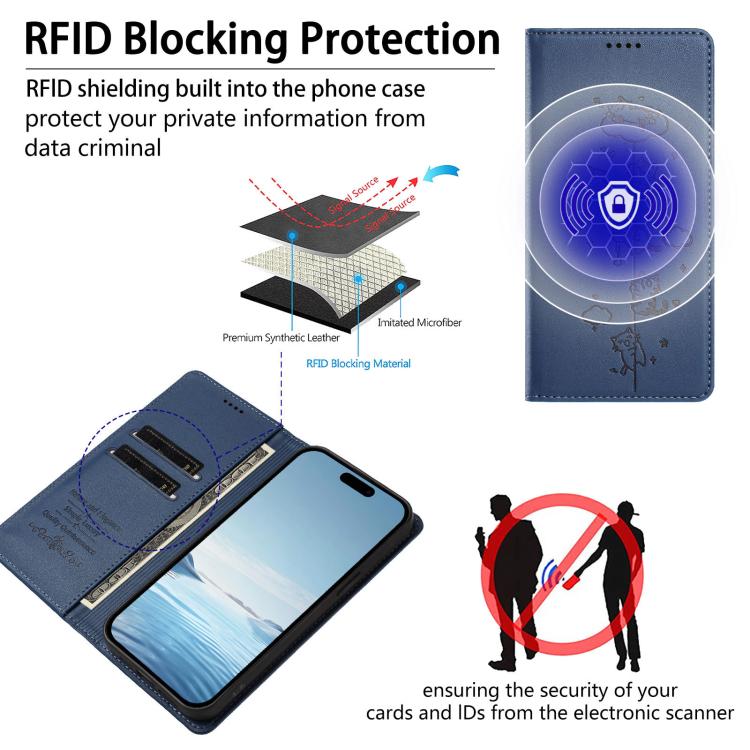 For iPhone 11 Pro Max Cute Cats Embossed Magnetic RFID Vegan Leather Phone Case(Dark Blue)