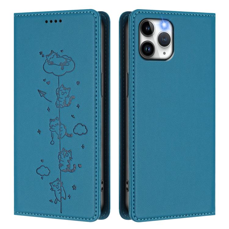 For iPhone 11 Pro Max Cute Cats Embossed Magnetic RFID Vegan Leather Phone Case(Lake Blue)