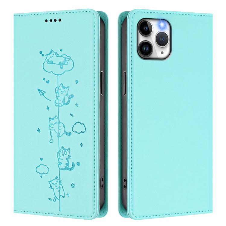 For iPhone 11 Pro Max Cute Cats Embossed Magnetic RFID Vegan Leather Phone Case(Mint Green)