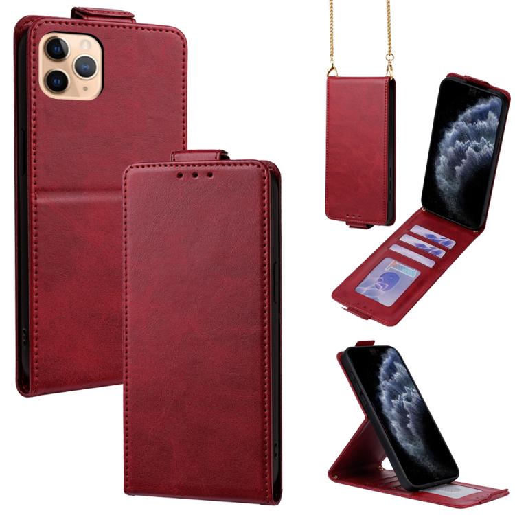 For iPhone 11 Pro Max Vertical Flip Cover Solid Color Vegan Leather Phone Case with Crossbody Chain(Red)