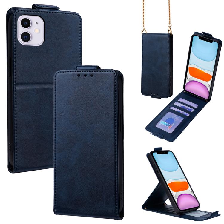 For iPhone 11 Vertical Flip Cover Solid Color Vegan Leather Phone Case with Crossbody Chain(Blue)