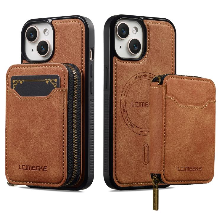 For iPhone 13 mini LC.IMEEKE L6 Series Zipper Card Bag MagSafe Magnetic Phone Case(Brown)