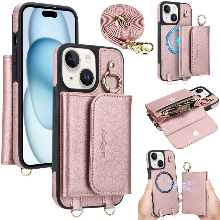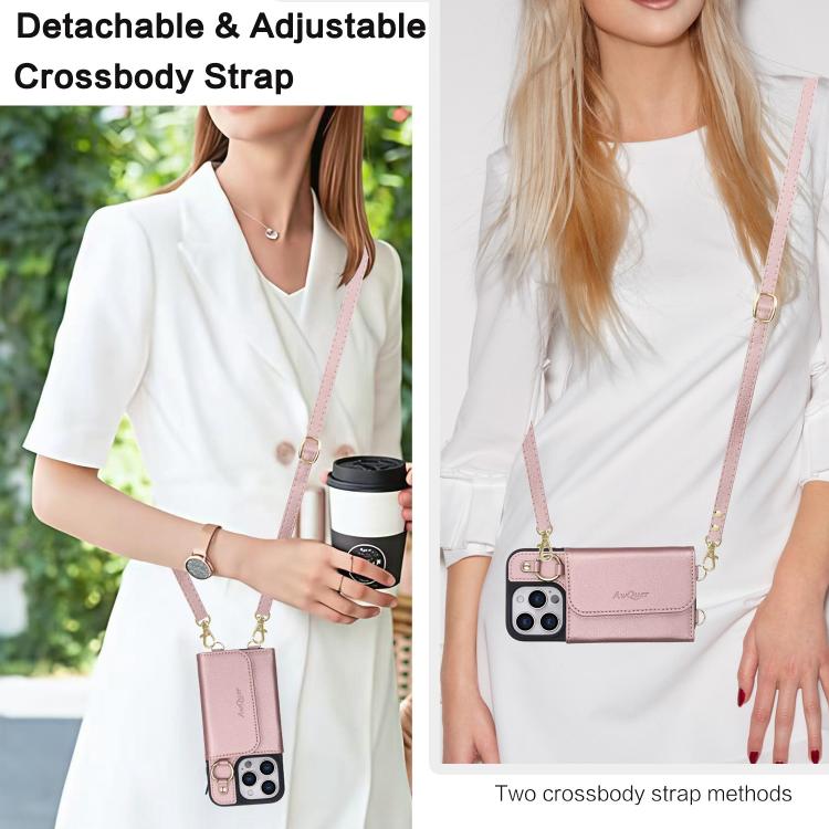For iPhone 15 AwQuer 2 in 1 Crossbody Wallet Leather Back Phone Case(Rose Gold)