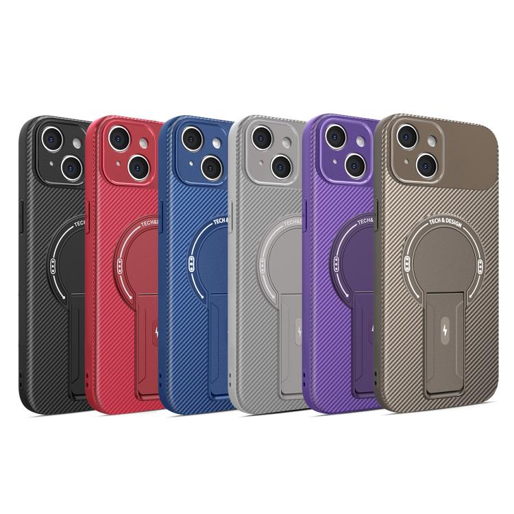 For iPhone 15 Carbon Fiber Texture MagSafe Phone Case with Holder(Grey)