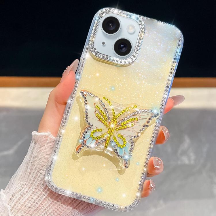 For iPhone 15 Diamond Glitter Butterfly Holder Phone Case(Light Yellow)