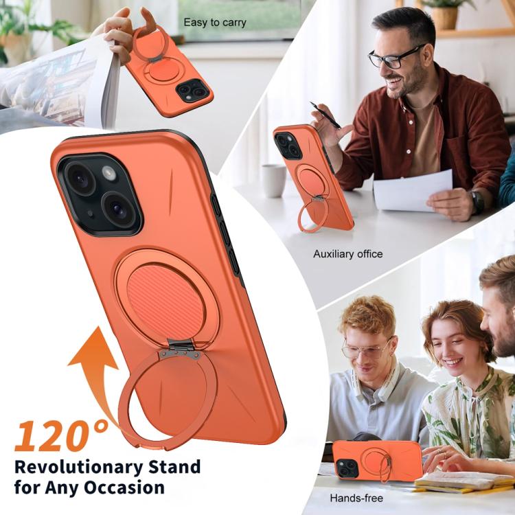 For iPhone 15 Metal Rotation Holder MagSafe TPU Hybrid PC Phone Case(Orange)