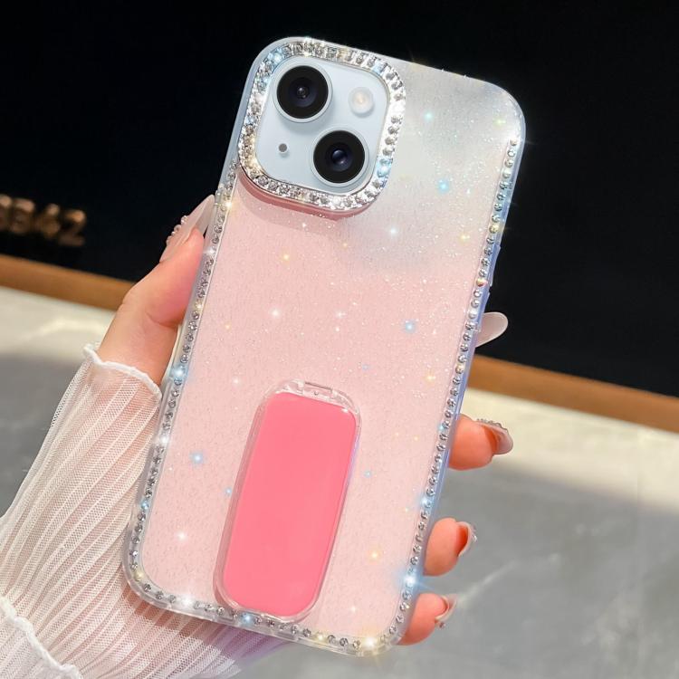 For iPhone 15 Rhinestone Glitter TPU 4-corners Anti-fall Phone Case with Holder(Light Pink)