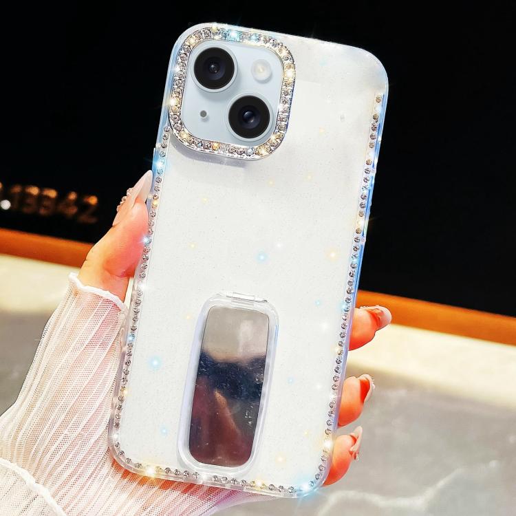 For iPhone 15 Rhinestone Glitter TPU 4-corners Anti-fall Phone Case with Holder(Transparent)