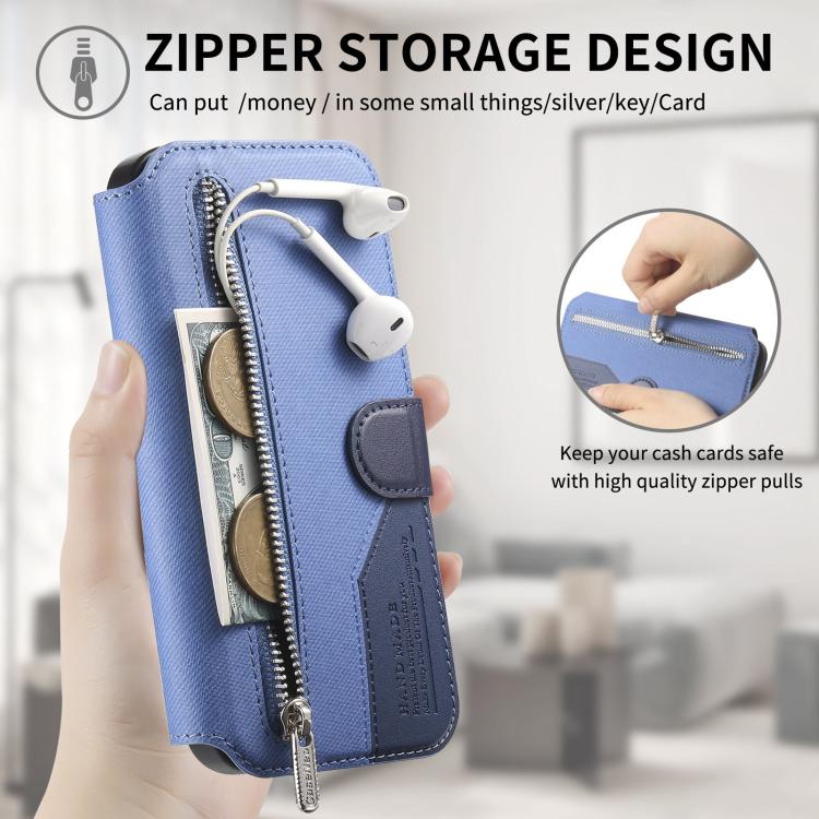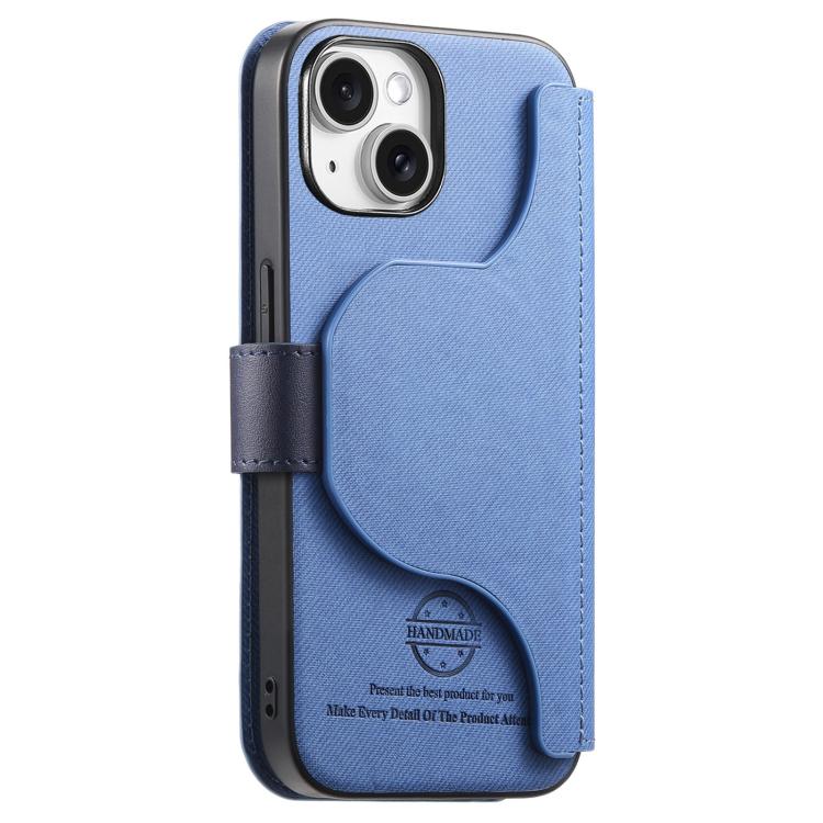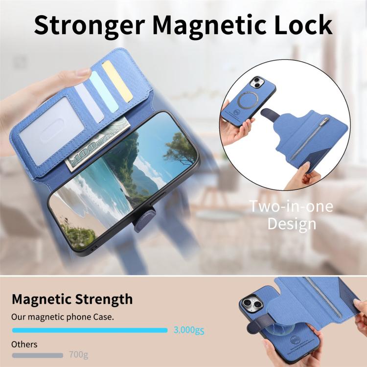For iPhone 15 Twill Fabric MagSafe RFID Anti-theft Zipper Wallet Leather Phone Case(Dark Blue)