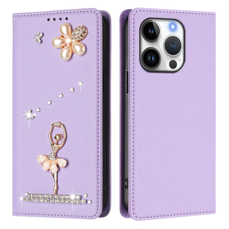 For iPhone 16 Pro Ballet Girl Diamond Studded RFID Vegan Leather Phone Case(Light Purple)