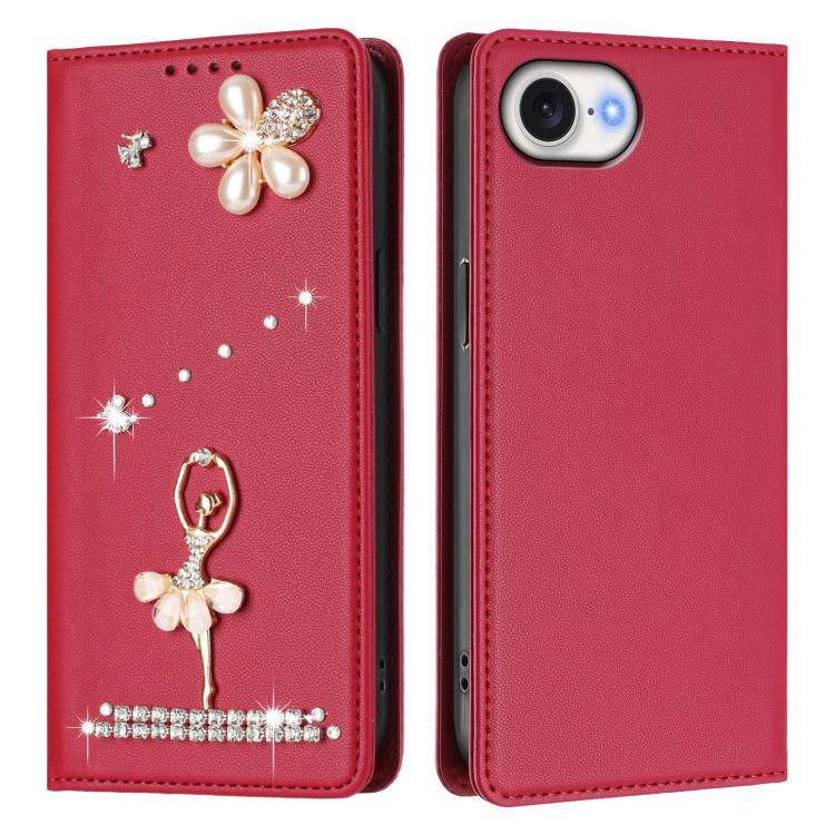 For iPhone 16e Ballet Girl Diamond Studded RFID Vegan Leather Phone Case(Wine Red)