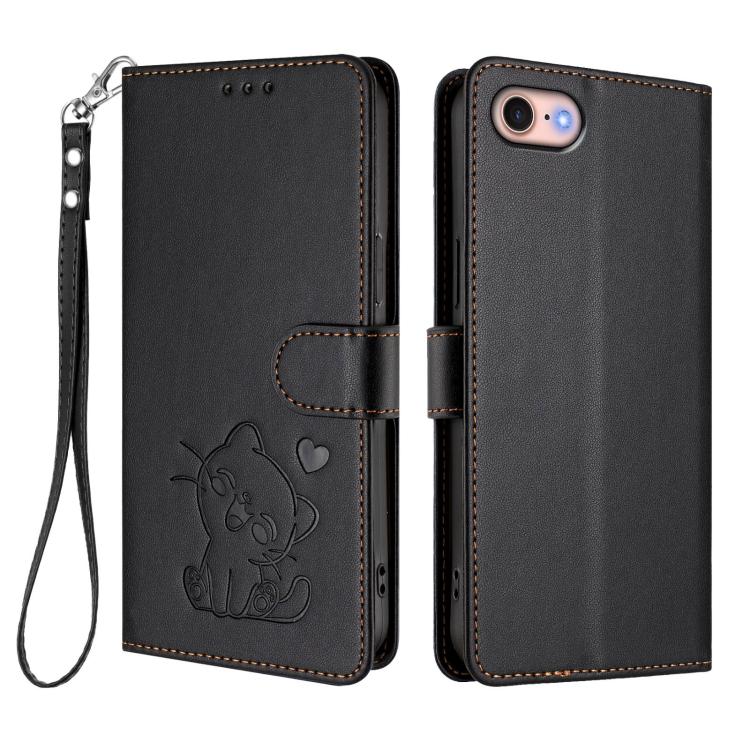 For iPhone 7 / 8 / SE 2022 Embossed Heart Cat Leather Phone Case with Hand Strap(Black)