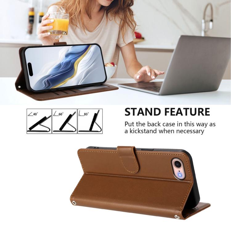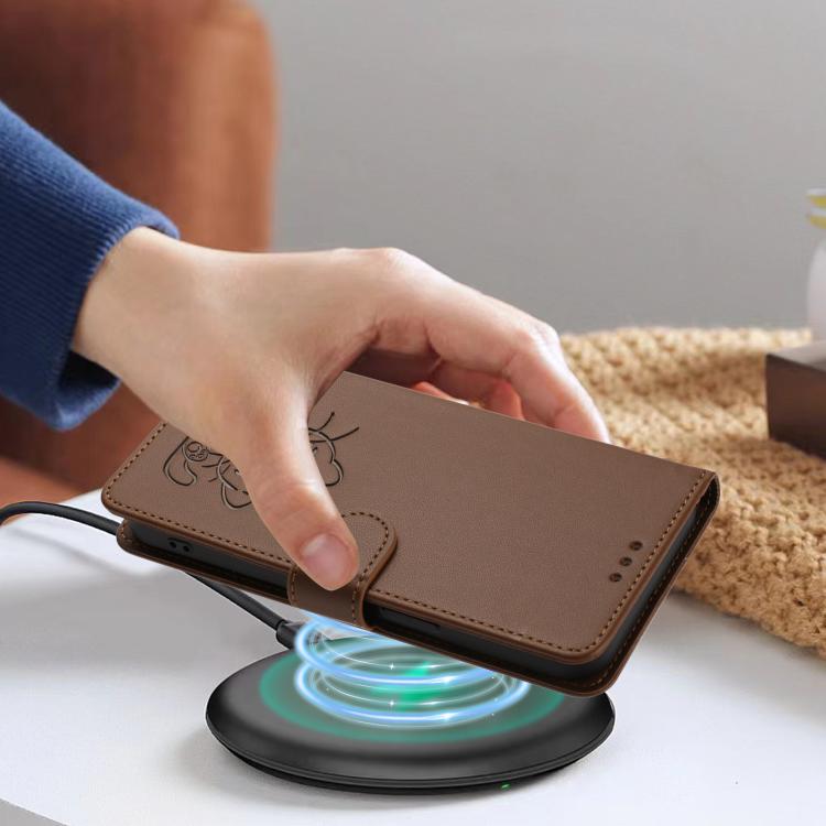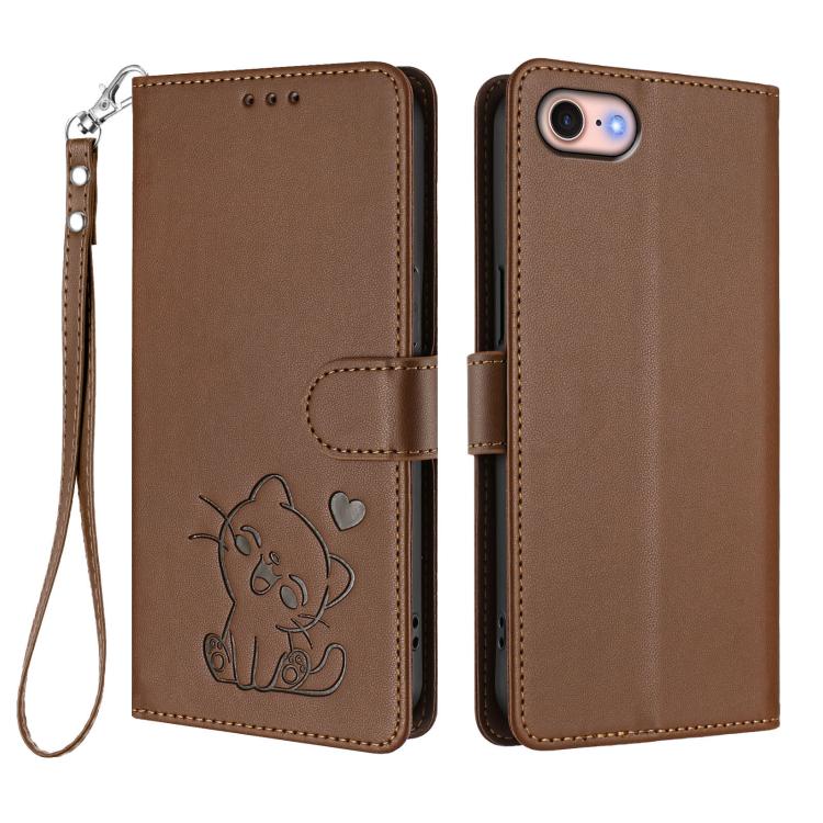 For iPhone 7 / 8 / SE 2022 Embossed Heart Cat Leather Phone Case with Hand Strap(Brown)