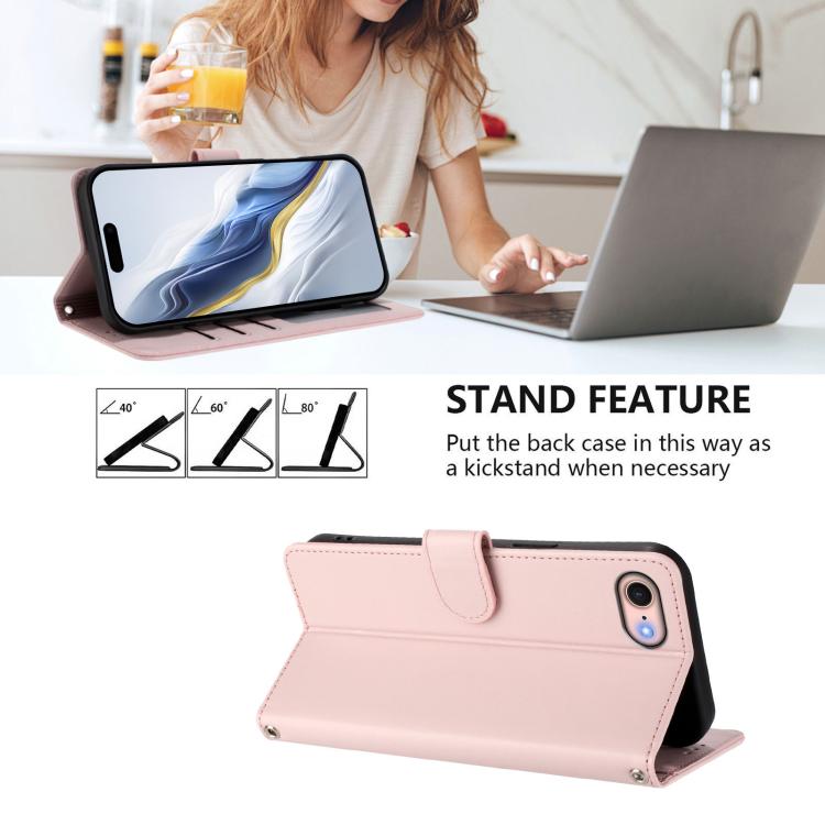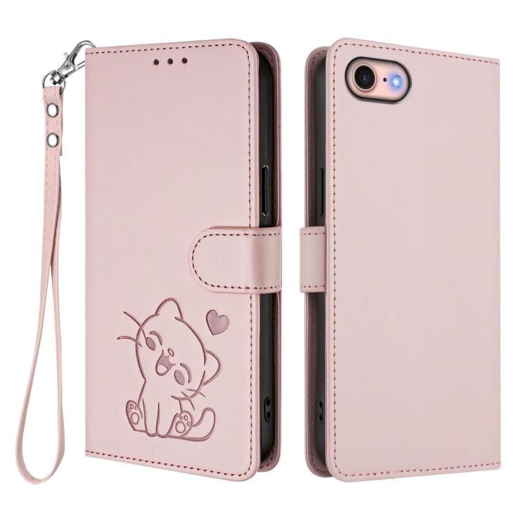 For iPhone 7 / 8 / SE 2022 Embossed Heart Cat Leather Phone Case with Hand Strap(Pink)