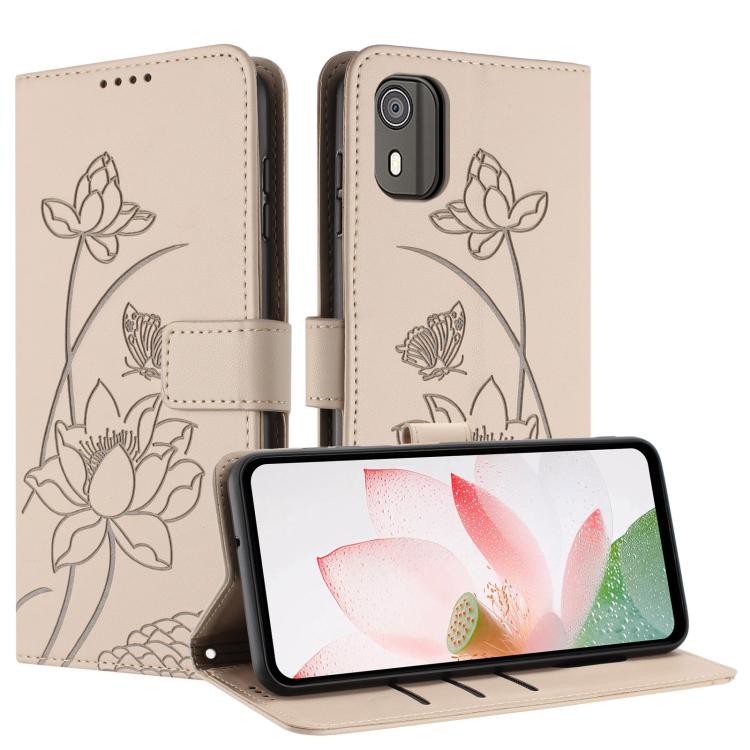 For Nokia C02 Lotus Embossed Leather Phone Case with Lanyard(Beige)