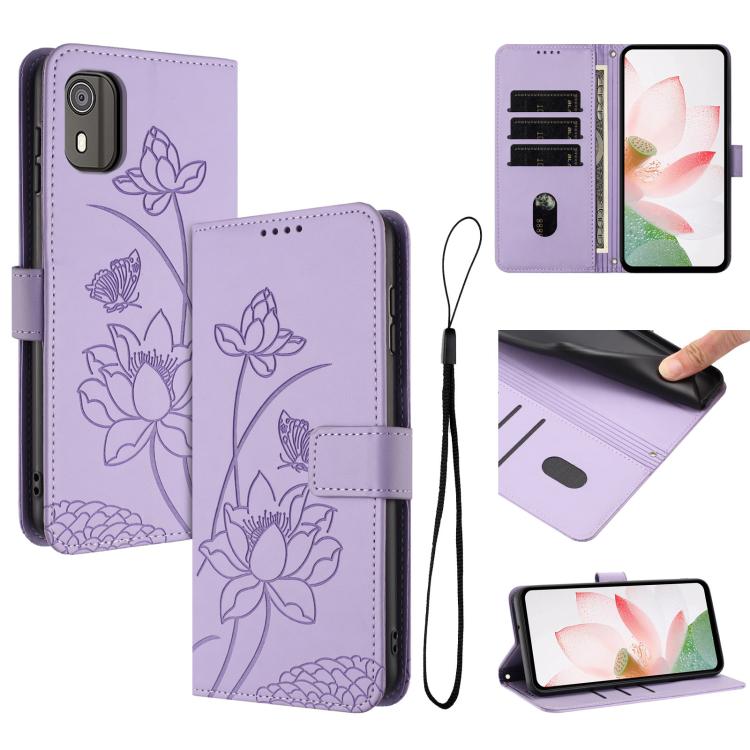 For Nokia C02 Lotus Embossed Leather Phone Case with Lanyard(Purple)