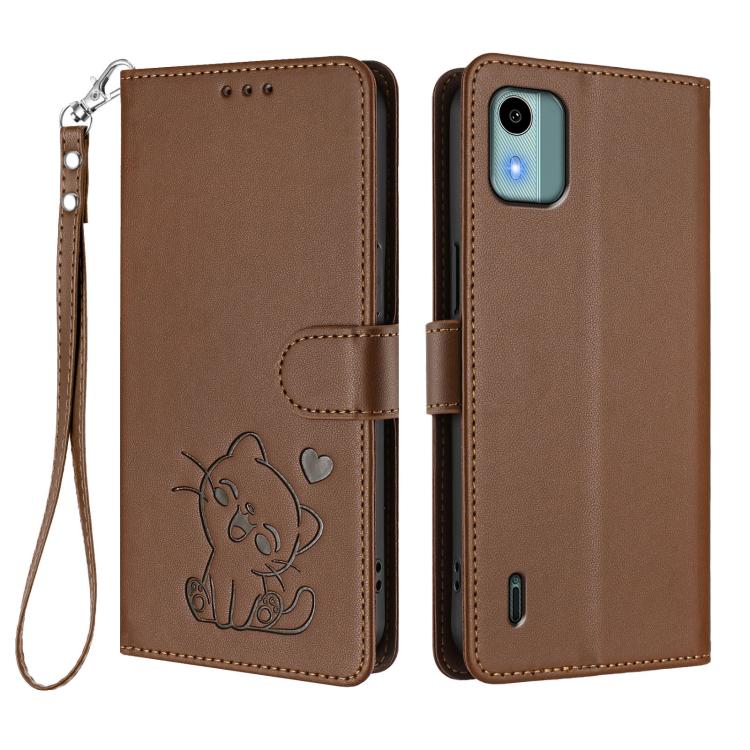 For Nokia C12 Embossed Heart Cat Leather Phone Case with Hand Strap(Brown)