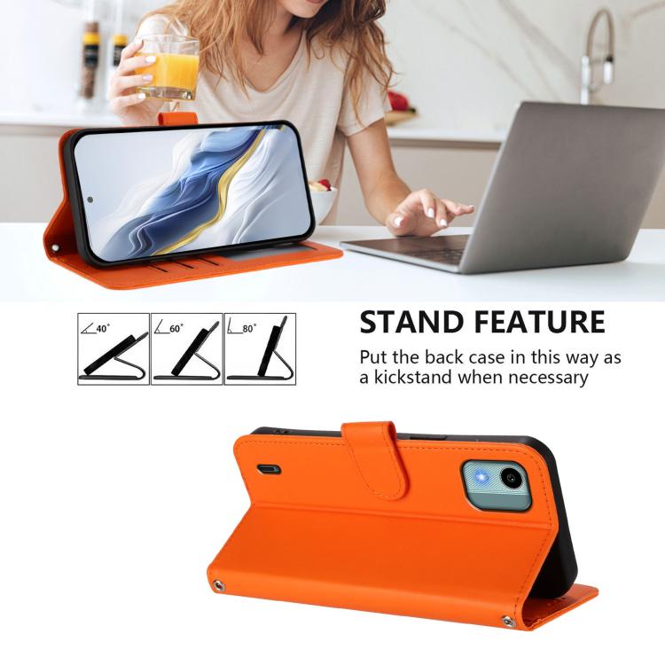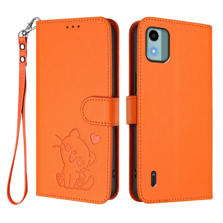For Nokia C12 Embossed Heart Cat Leather Phone Case with Hand Strap(Orange)