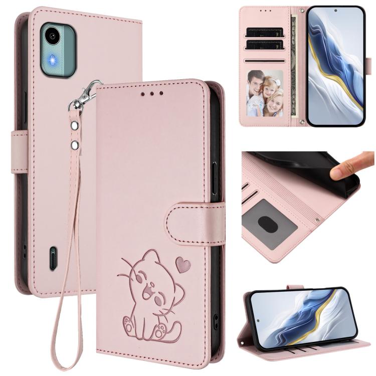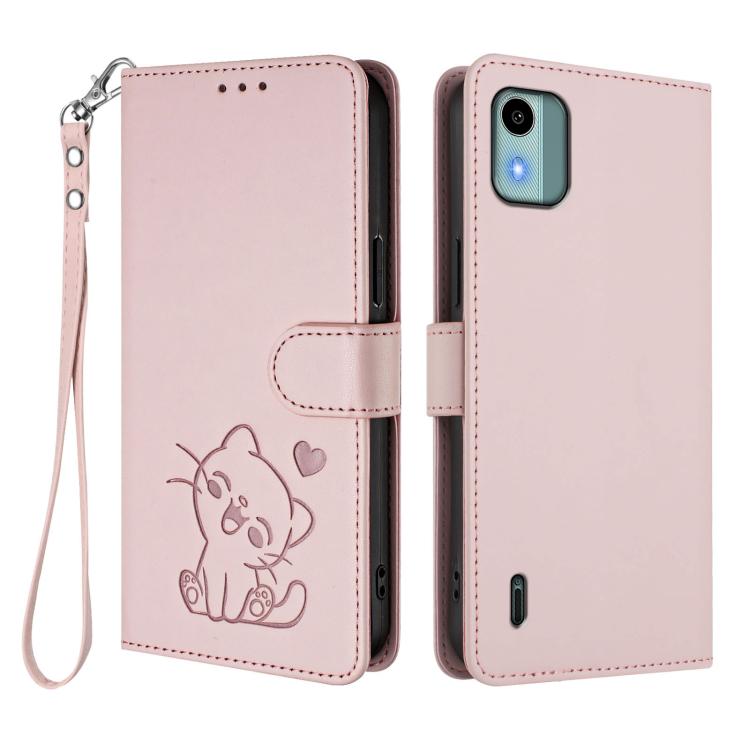 For Nokia C12 Embossed Heart Cat Leather Phone Case with Hand Strap(Pink)