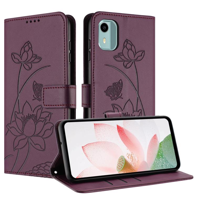 For Nokia C12 Lotus Embossed Leather Phone Case with Lanyard(Wine Red)