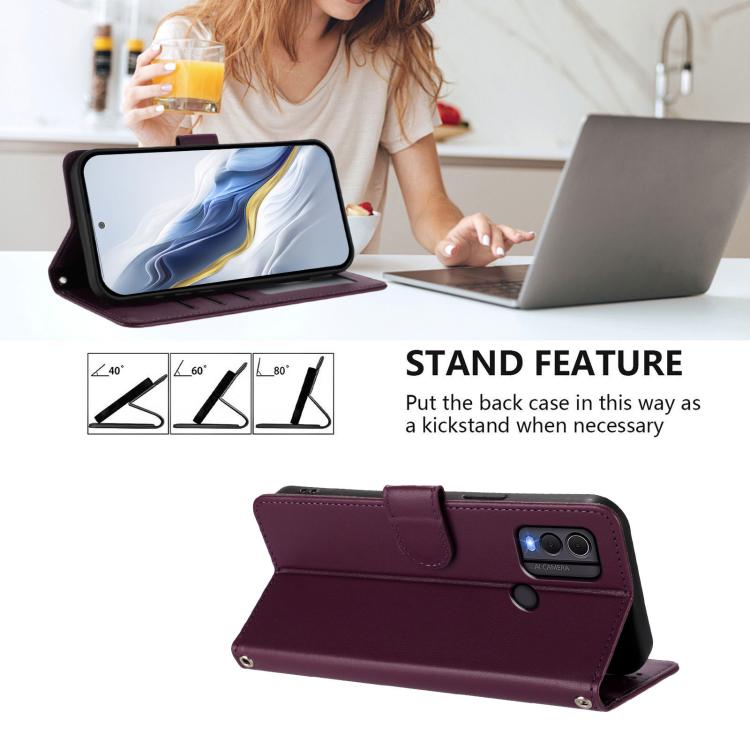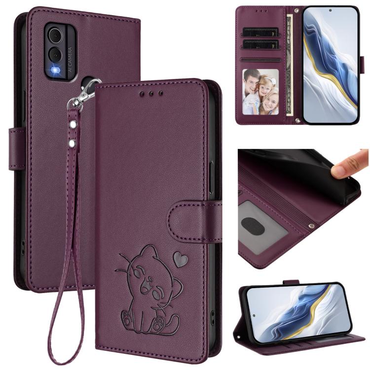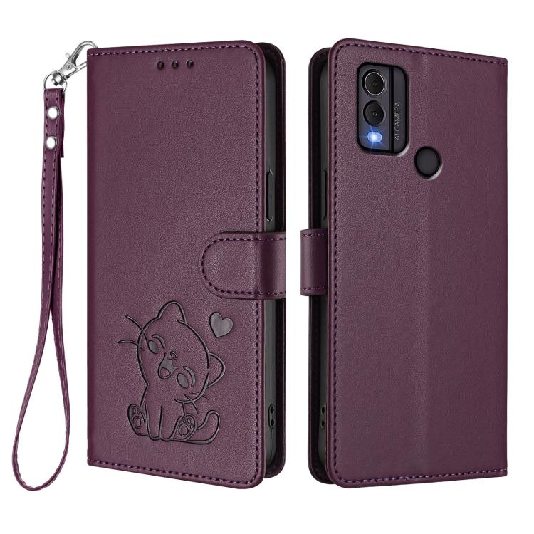 For Nokia C22 Embossed Heart Cat Leather Phone Case with Hand Strap(Dark Purple)