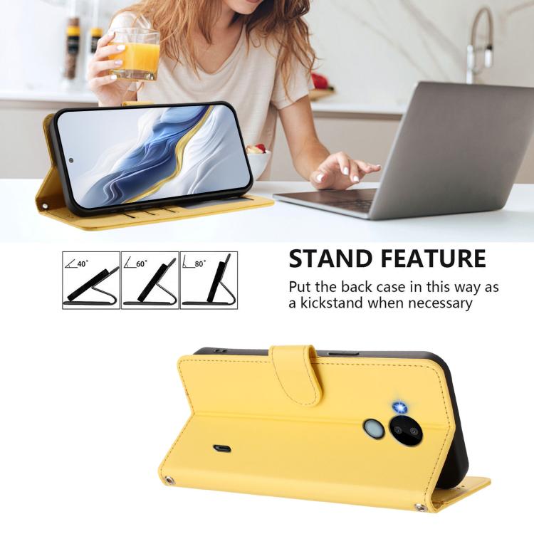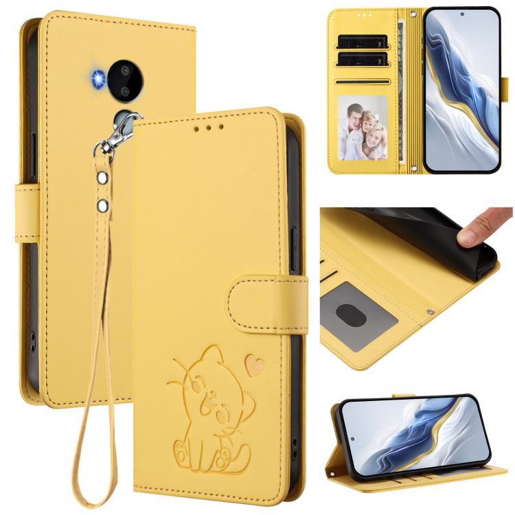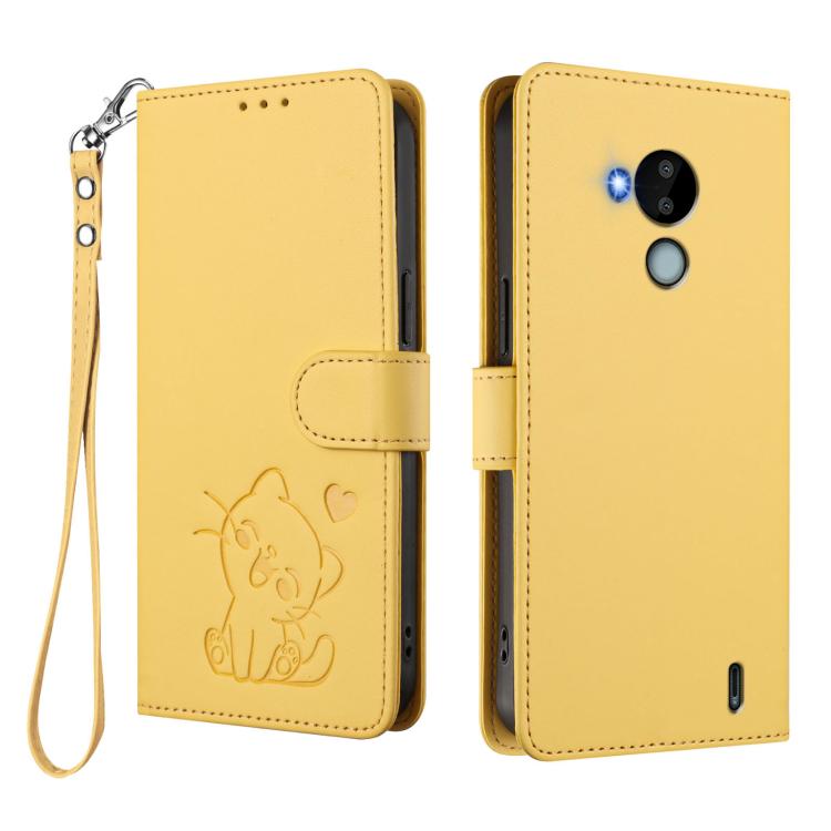 For Nokia C30 Embossed Heart Cat Leather Phone Case with Hand Strap(Yellow)